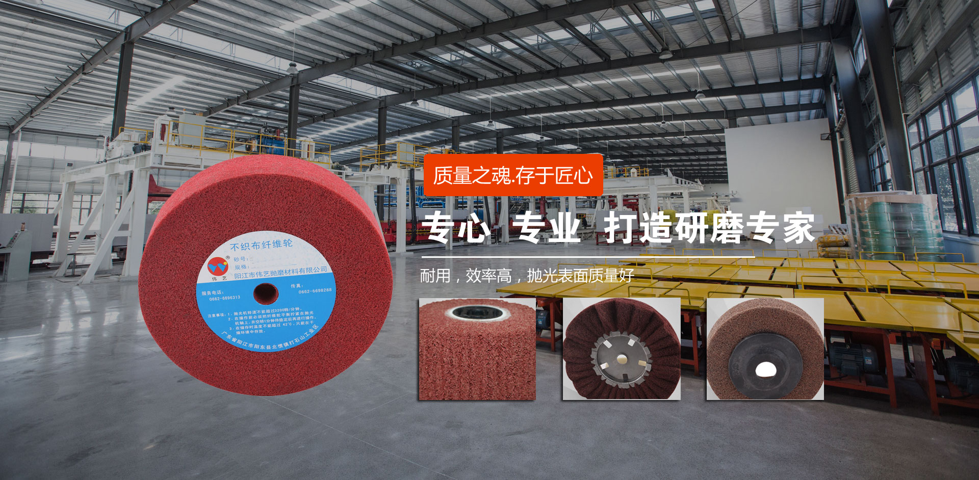 陽(yáng)江市偉藝拋磨材料有限公司座落于中國(guó)刀剪之都——陽(yáng)江市,具有近二十年尼龍輪生產(chǎn)和銷(xiāo)售經(jīng)驗(yàn),生產(chǎn)基地占地面積4.6萬(wàn)多平方米。偉藝公司立足自主研發(fā),致力于產(chǎn)業(yè)化發(fā)展。現(xiàn)已研發(fā)、生產(chǎn)了尼龍輪、擦色輪、飛翼輪、拉絲輪、清潔拋、不織布刷輥、工業(yè)擦布、塑膠研磨石、金剛砂、噴膠棉等十多種應(yīng)用于多種領(lǐng)域的研磨材料,并可以根據(jù)客戶的需求提供針對(duì)性解決方案和個(gè)性化服務(wù)。 偉藝公司致...
